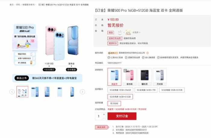 目前,荣耀 500 系列已在官方商城上架预约,拥有海蓝宝、星光风、曜石黑和月光银四种配色,容量版本有:12GB+256GB、12GB+512GB、16GB+512GB 和 16GB+1TB。