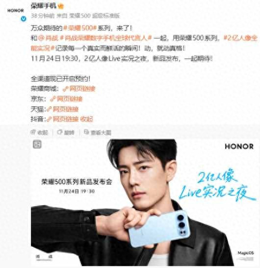 太平洋科技快讯】11 月 17 日消息,荣耀 500 系列新品发布会定档 11 月 24 日 19:30 举行,肖战为荣耀数字手机全球代言人。