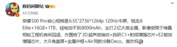 根据数码博主“数码闲聊站”此前爆料,荣耀 500 Pro 采用 6.55 英寸 120Hz 中屏,分辨率 2736×1264p;搭载骁龙 8 Elite 处理器,有 16GB+1TB 容量版本;配备 8000mAh 硅电池;后置 2 亿像素大底主摄(影像受限于堆叠较工程机有所回退);配备 3D 超声波指纹、自研 C1+ 视频增强芯片、E2 能效增强芯片;外观为大 R 角直屏 + 金属中框 + Air 同款冷雕 Deco。
